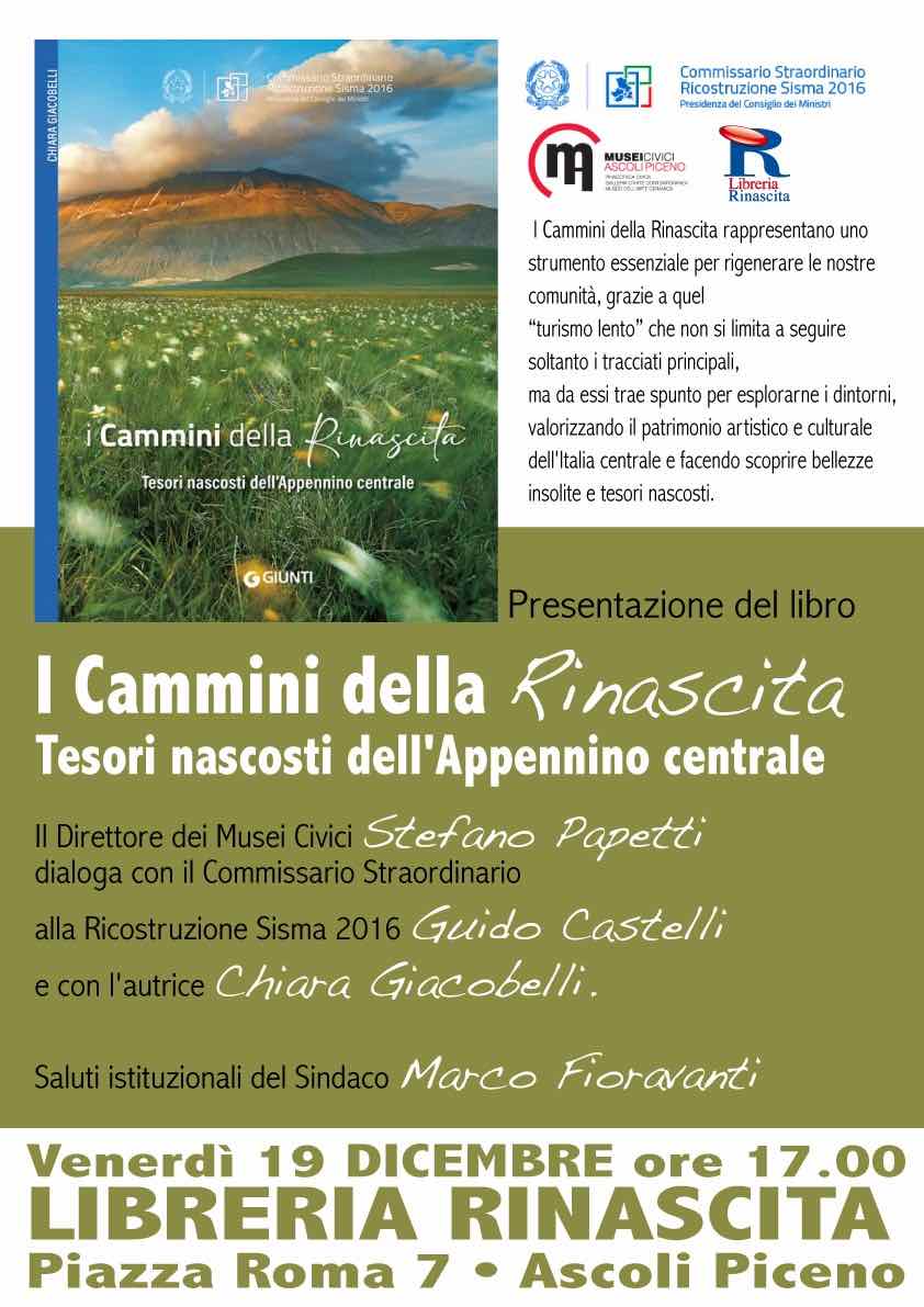 ASCOLI PICENO – Si terrà venerdì 19 dicembre alle ore 17 presso la libreria Rinascita di Ascoli Piceno in Piazza Roma 7, la presentazione del libro “I Cammini della Rinascita. Tesori nascosti dell’Appennino centrale” (Giunti Editore) di Chiara Giacobelli.