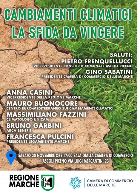 ASCOLI PICENO – Sabato, 30 novembre 2019, alle ore 17.00, presso la Sala Gialla della Camera di Commercio di Ascoli Piceno sita in via Luigi Mercantini n.23, si terrà il seminario “Cambiamenti climatici la Sfida da Vincere”.