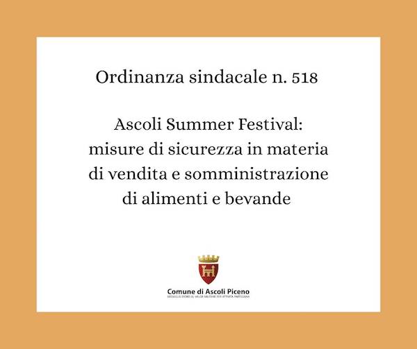 ASCOLI PICENO – Con l’Ordinanza sindacale n. 518 del 7 agosto 2025 il sindaco di Ascoli Piceno ordina, ad integrazione dell’Ordinanza Sindacale n. 796 del 17/12/2024, in concomitanza dello svolgimento della manifestazione “Ascoli Summer Festival 2025” che si terrà nei giorni 11 e 12 agosto 2025 presso l’impianto sportivo Squarcia: