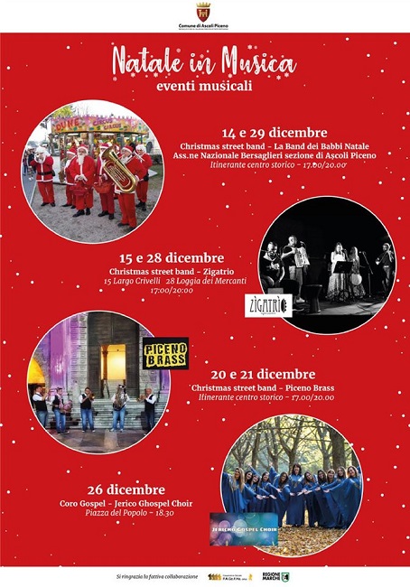 ASCOLI PICENO – Fine settimana ricco di attività natalizie nel centro storico di Ascoli Piceno. Si parte venerdì 20 e sabato 21 dicembre con un doppio appuntamento musicale: dalle ore 17 alle 20, in maniera itinerante per le vie del centro, si esibirà la Christmas Street Band “Piceno Brass”. Iniziative per i più piccini nel pomeriggio di sabato: dalle ore 16:30 alle ore 19:30 in Sala Cola d’Amatrice appuntamento con il Riù Itinerante, per creare“Il tuo Babbo Natale” utilizzando fogli di carta, colori e dischetti di cotone.
