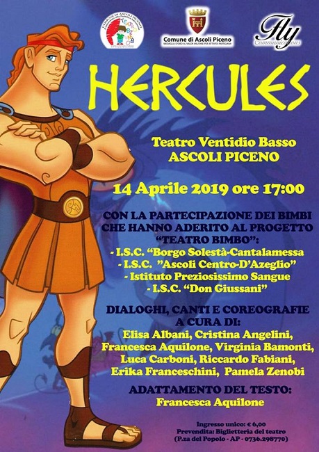 ASCOLI PICENO – Domenica 14 Aprile alle ore 17.00 andrà in scena “Hercules”, spettacolo conclusivo del progetto “Teatro Bimbo”, curato dall’associazione ascolana Fly Communications con il patrocinio del Comune di Ascoli Piceno. Una speciale occasione per circa 200 bambini delle scuole primarie della città di vivere una giornata all’insegna del teatro e del sorriso al termine di un percorso durato più di 3 mesi.