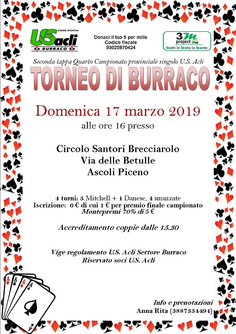Vige il regolamento U.S. Acli settore burraco, l’iniziativa è riservata ai soci dei circoli ed associazioni di burraco dell’U.S. Acli.