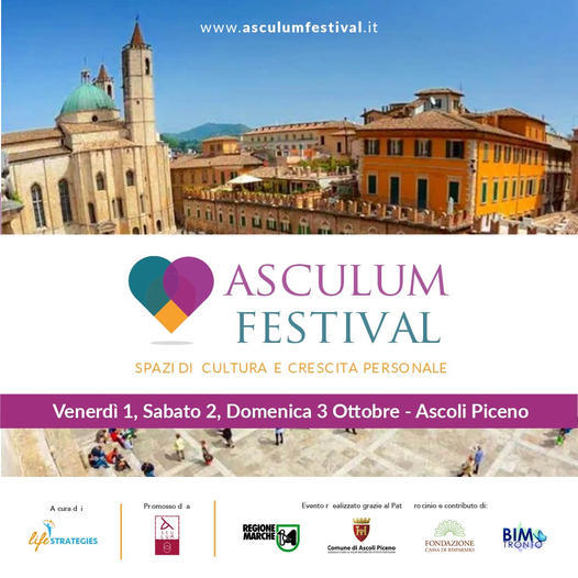 ASCOLI PICENO – Venerdì 1, sabato 2 e domenica 3 ottobre 2021 si svolgerà Asculum Festival, uno tra i più importanti festival interamente dedicati a cultura e crescita personale.