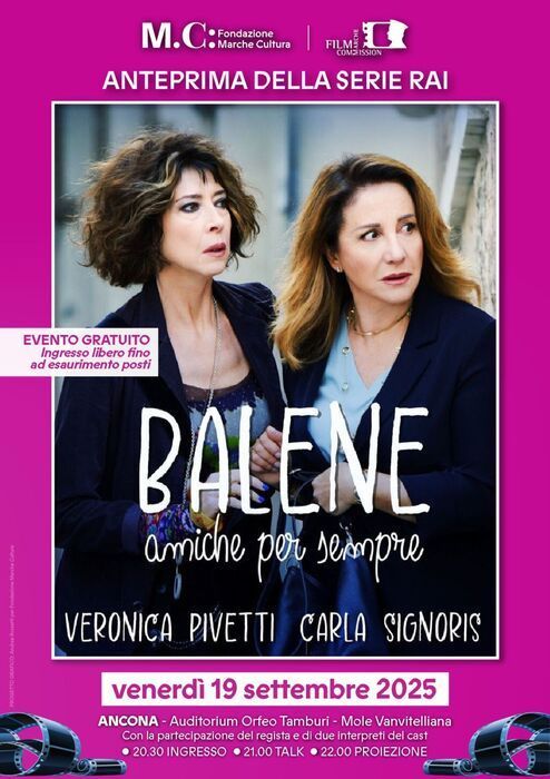 ANCONA – In anteprima nazionale per il pubblico verrà proiettata ad Ancona la prima puntata della nuova attesa miniserie televisiva Balene, interamente girata nelle Marche, venerdì prossimo 19 settembre, alle ore 20,30, nella storica e suggestiva cornice della Mole Vanvitelliana di Ancona, all’ Auditorium Orfeo Tamburi.