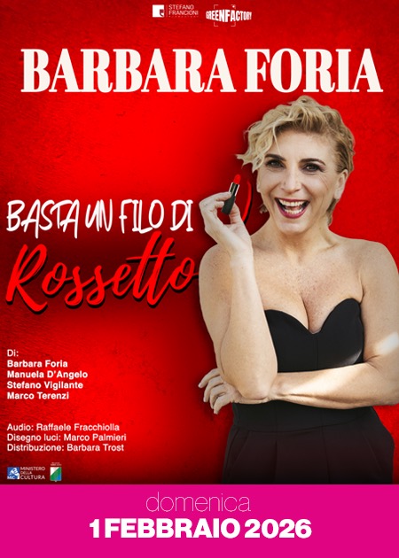 TOLENTINO – Domenica primo febbraio 2026, alle ore 18.00, al Politeama di Tolentino, Barbara Foria porta in scena il suo one-woman show “Basta un filo di rossetto”. L’evento si inserisce nella stagione teatrale 2025-2026 e promette una serata all’insegna del divertimento e della travolgente comicità dell’artista napoletana. Testo di Barbara Foria, Manuela D’Angelo, Stefano Vigilante per la Regia di Marco Terenzi.