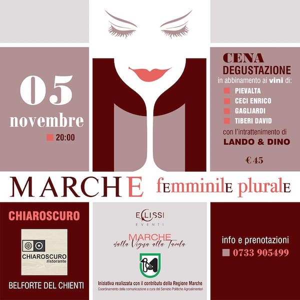BELFORTE DEL CHIENTI (MC) – All’hotel ristorante Chiaroscuro di Belforte del Chienti , la cena degustazione del progetto Marche Femminile Plurale, del bando regionale Dalla Vigna alla Tavola. Appuntamento per venerdì 5 novembre alle ore 20. Durante la serata lo show del duo Lando e Dino.