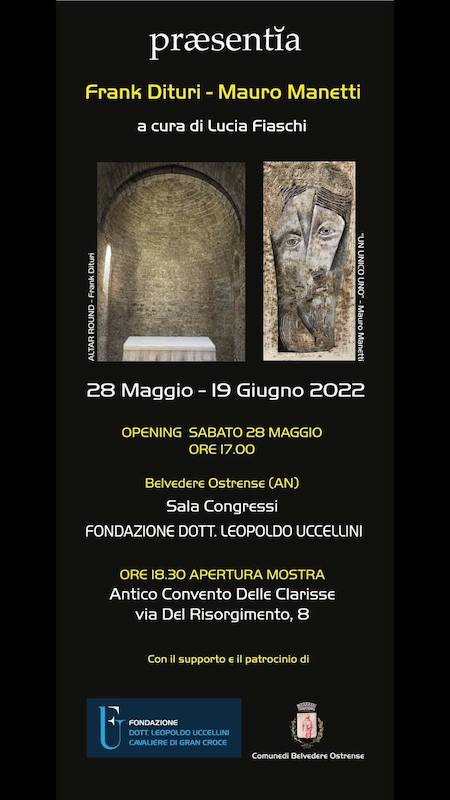 Dal 28 maggio al 19 giugno 2022 a Belvedere Ostrense si terrà la Mostra internazionale d’arte di Frank Dituri e Mauro Manetti “Praesentia”, curata da Lucia Fiaschi che introdurrà l’evento presso la Sala Congressi del Palazzo Fondazione Uccellini.