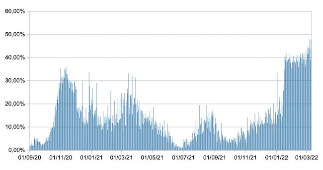 Il grafico mostra la percentuale di tamponi positivi giornalieri su tamponi giornalieri testati ( diagnostici+quelli di controllo) nel periodo 1 settembre 2020 – 10 marzo 2022 in Italia.