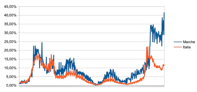 Il grafico seguente illustra l’andamento della percentuale giornaliera di nuovi casi positivi rispetto al corrispondente numero di tamponi (diagnostici +quelli di controllo) effettuati a livello nazionale e nella regione Marche nel periodo 1 settembre 2020 – 10 marzo 2022.