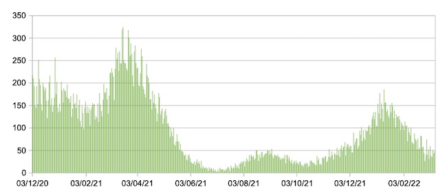 Nel grafico sono riportati i valori medi settimanali.Il valore medio della settimana 27/02/22-05/03/22 è 627,23 (la scorsa settimana era 790,60):netta discesa della curva in cinque settimane.