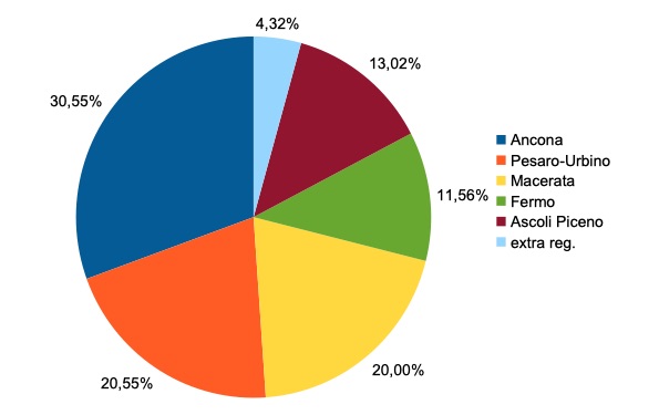 630 in provincia di Ancona,250 in provincia di Pesaro-Urbino,384 nella provincia di Macerata,225 nella provincia di Fermo, 300 nella provincia di Ascoli Piceno,104 residenti fuori regione.