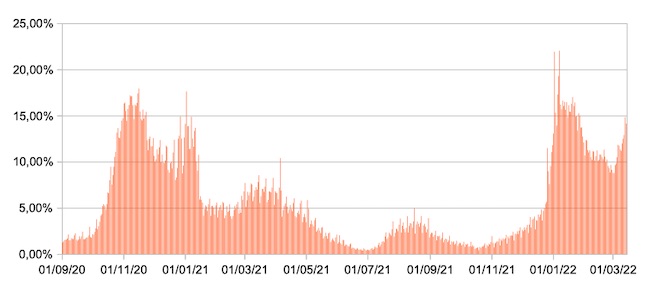 Il grafico mostra la percentuale di tamponi positivi giornalieri su tamponi giornalieri testati ( diagnostici+quelli di controllo) nel periodo 1 settembre 2020 – 14 marzo 2022 in Italia.