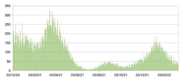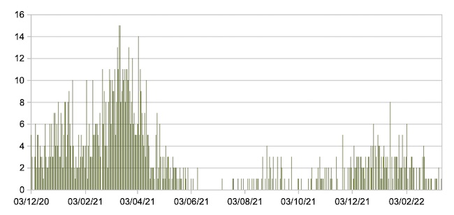 Il grafico seguente mostra i dati giornalieri relativi ai nuovi ingressi in terapia intensiva nelle Marche 3 dicembre 2020 – 14 marzo 2022.