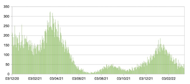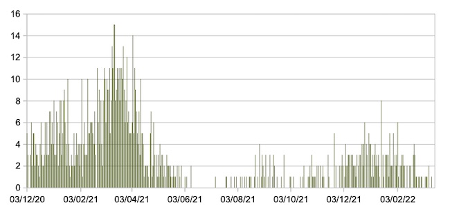 Il grafico seguente mostra i dati giornalieri relativi ai nuovi ingressi in terapia intensiva nelle Marche 3 dicembre 2020 – 17 marzo 2022.