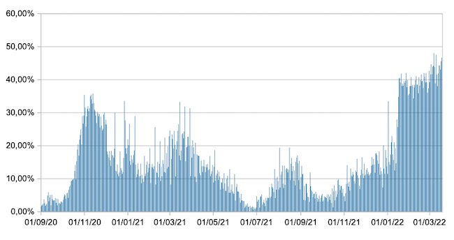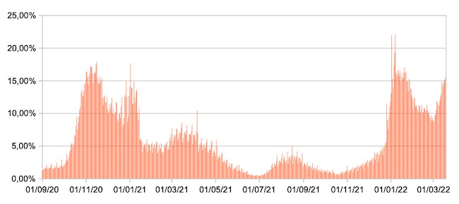 Il grafico mostra la percentuale di tamponi positivi giornalieri su tamponi giornalieri testati ( diagnostici+quelli di controllo) nel periodo 1 settembre 2020 – 18 marzo 2022 in Italia.