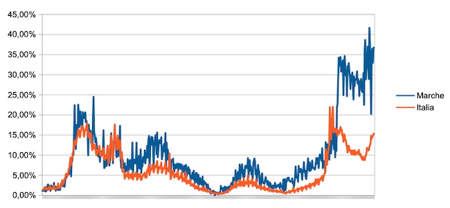 Il grafico seguente illustra l’andamento della percentuale giornaliera di nuovi casi positivi rispetto al corrispondente numero di tamponi (diagnostici +quelli di controllo) effettuati a livello nazionale e nella regione Marche nel periodo 1 settembre 2020 – 18 marzo 2022.