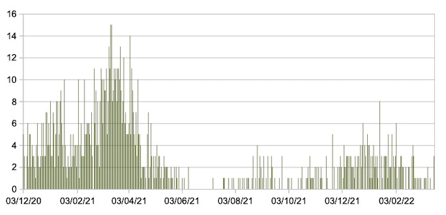 Il grafico seguente mostra i dati giornalieri relativi ai nuovi ingressi in terapia intensiva nelle Marche 3 dicembre 2020 – 18 marzo 2022.