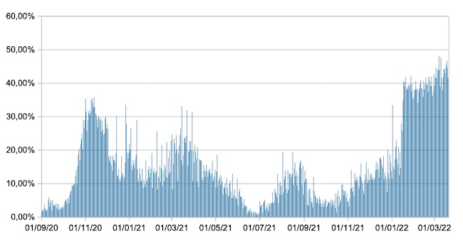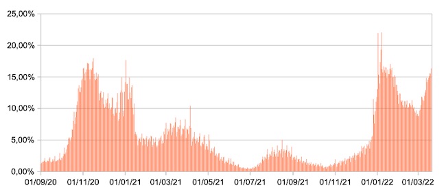 Il grafico mostra la percentuale di tamponi positivi giornalieri su tamponi giornalieri testati ( diagnostici+quelli di controllo) nel periodo 1 settembre 2020 – 20 marzo 2022 in Italia.