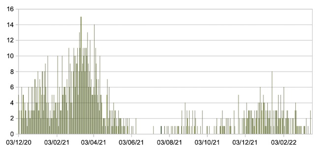 Il grafico seguente mostra i dati giornalieri relativi ai nuovi ingressi in terapia intensiva nelle Marche 3 dicembre 2020 – 20 marzo 2022.