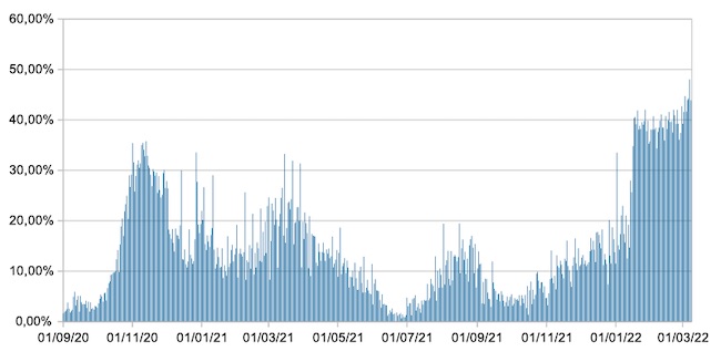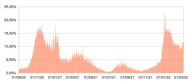 Il grafico mostra la percentuale di tamponi positivi giornalieri su tamponi giornalieri testati ( diagnostici+quelli di controllo) nel periodo 1 settembre 2020 – 8 marzo 2022 in Italia.