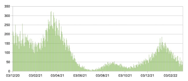 Nel grafico sono riportati i valori medi settimanali.Il valore medio della settimana 27/02/22-05/03/22 è 627,23 (la scorsa settimana era 790,60):netta discesa della curva in cinque settimane.