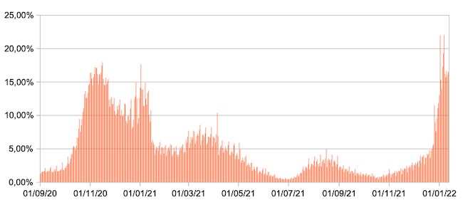 Il grafico mostra la percentuale di tamponi positivi giornalieri su tamponi giornalieri testati ( diagnostici+quelli di controllo) nel periodo 1 settembre 2020 – 12 gennaio 2022 in Italia.
