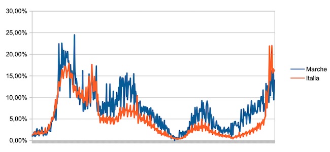 Il grafico seguente illustra l’andamento della percentuale giornaliera di nuovi casi positivi rispetto al corrispondente numero di tamponi (diagnostici +quelli di controllo) effettuati a livello nazionale e nella regione Marche nel periodo 1 settembre 2020 – 12 gennaio 2022.