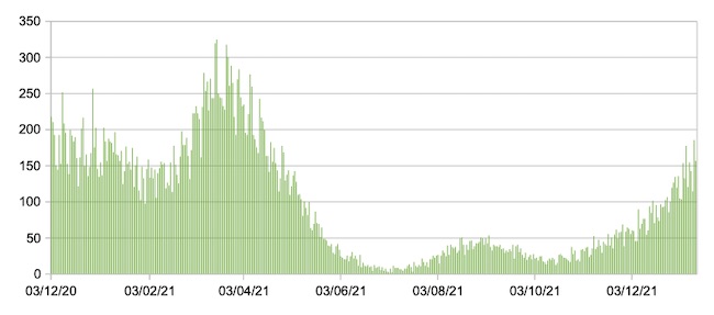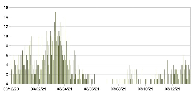 Il grafico seguente mostra i dati giornalieri relativi ai nuovi ingressi in terapia intensiva nelle Marche 3 dicembre 2020 – 12 gennaio 2022.