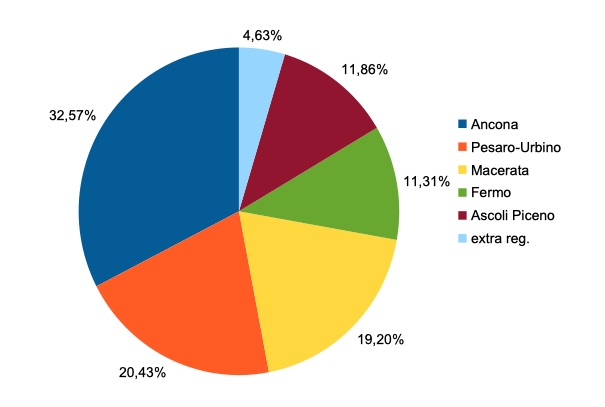 Del totale dei casi positivi 53.883 si riferiscono alla provincia di Ancona, 33.794 a quella di Pesaro-Urbino ,31.758 alla provincia di Macerata,18.709 a quella di Fermo, 19.618 a quella di Ascoli Piceno. Il servizio sanitario regionale delle Marche segue anche 7.659 casi fuori regione.