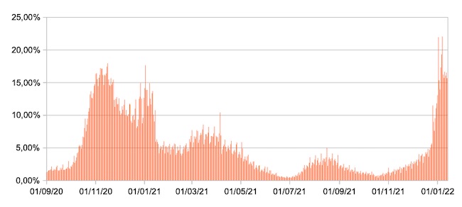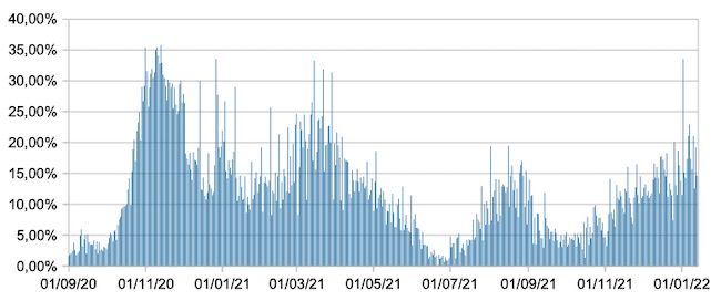 Il grafico mostra la percentuale di tamponi positivi giornalieri su tamponi giornalieri testati ( diagnostici+quelli di controllo) nel periodo 1 settembre 2020 – 13 gennaio 2022 in Italia.
