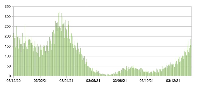 Il grafico seguente mostra i dati giornalieri relativi ai nuovi ingressi in terapia intensiva nelle Marche 3 dicembre 2020 – 13 gennaio 2022.