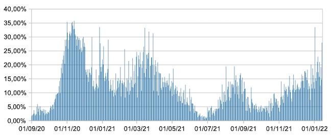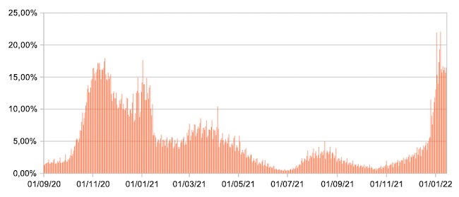 Il grafico mostra la percentuale di tamponi positivi giornalieri su tamponi giornalieri testati ( diagnostici+quelli di controllo) nel periodo 1 settembre 2020 – 14 gennaio 2022 in Italia.