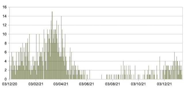 Il grafico seguente mostra i dati giornalieri relativi ai nuovi ingressi in terapia intensiva nelle Marche 3 dicembre 2020 – 14 gennaio 2022.