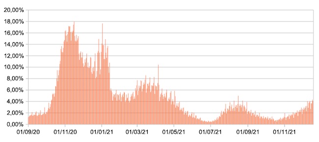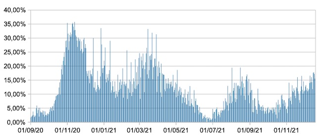 Il grafico mostra la percentuale di tamponi positivi giornalieri su tamponi giornalieri testati ( diagnostici+quelli di controllo) nel periodo 1 settembre 2020 –18 dicembre 2021 in Italia.