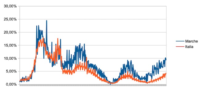 Il grafico seguente illustra l’andamento della percentuale giornaliera di nuovi casi positivi rispetto al corrispondente numero di tamponi (diagnostici +quelli di controllo) effettuati a livello nazionale e nella regione Marche nel periodo 1 settembre 2020 – 18 dicembre 2021.