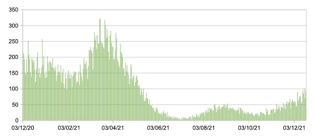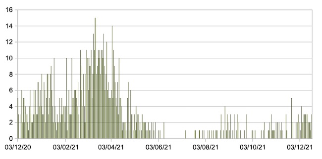 Il grafico seguente mostra i dati giornalieri relativi ai nuovi ingressi in terapia intensiva nelle Marche 3 dicembre 2020 – 18 dicembre 2021.