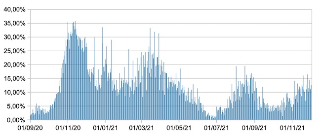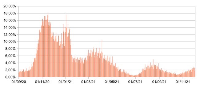 Il grafico mostra la percentuale di tamponi positivi giornalieri su tamponi giornalieri testati ( diagnostici+quelli di controllo) nel periodo 1 settembre 2020 – 2 dicembre 2021 in Italia.