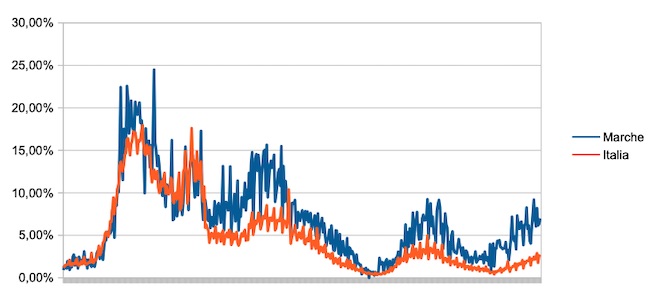 Il grafico seguente illustra l’andamento della percentuale giornaliera di nuovi casi positivi rispetto al corrispondente numero di tamponi (diagnostici +quelli di controllo) effettuati a livello nazionale e nella regione Marche nel periodo 1 settembre 2020 – 2 dicembre 2021.