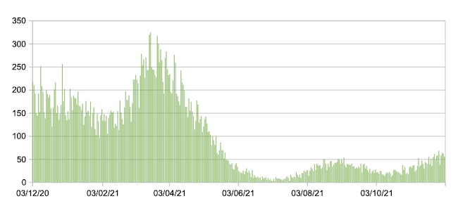 Dal grafico( dove sono riportati i valori medi settimanali) si evince che il tasso di incidenza è in risalita ed ha quasi triplicato la soglia dei 50 casi settimanali per 100.000 abitanti.Il valore medio della settimana 21/11-27/11 è 145,98.