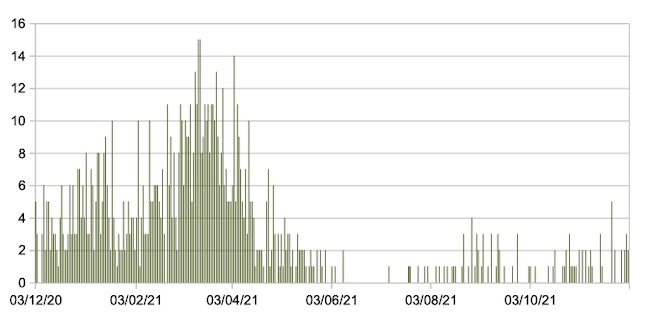 Il grafico seguente mostra i dati giornalieri relativi ai nuovi ingressi in terapia intensiva nelle Marche 3 dicembre 2020 – 2 dicembre 2021.