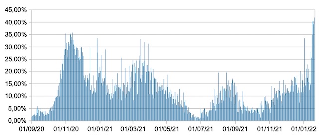 Il grafico mostra la percentuale di tamponi positivi giornalieri su tamponi giornalieri testati ( diagnostici+quelli di controllo) nel periodo 1 settembre 2020 – 20 gennaio 2022 in Italia.