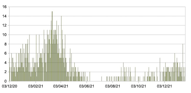 Il grafico seguente mostra i dati giornalieri relativi ai nuovi ingressi in terapia intensiva nelle Marche 3 dicembre 2020 – 20 gennaio 2022.