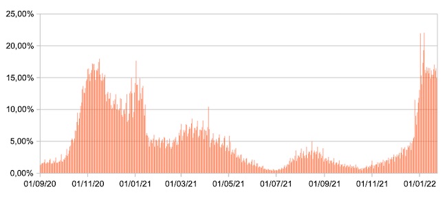 Il grafico mostra la percentuale di tamponi positivi giornalieri su tamponi giornalieri testati ( diagnostici+quelli di controllo) nel periodo 1 settembre 2020 – 23 gennaio 2022 in Italia.