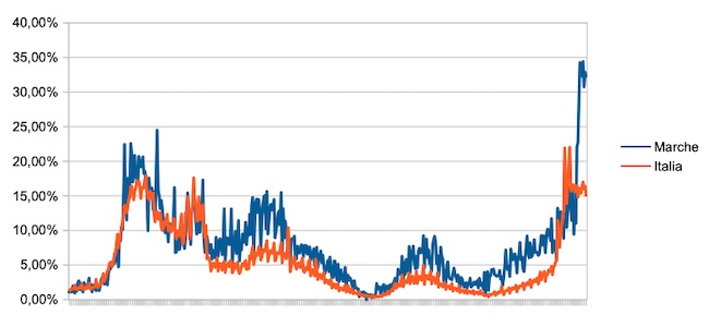 Il grafico seguente illustra l’andamento della percentuale giornaliera di nuovi casi positivi rispetto al corrispondente numero di tamponi (diagnostici +quelli di controllo) effettuati a livello nazionale e nella regione Marche nel periodo 1 settembre 2020 – 23 gennaio 2022.