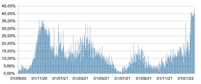 Negli ultimi giorni si registrano i valori più alti riscontrabili dal primo settembre 2020 del tasso di positività giornaliero, che oggi è il triplo di quello del 27/01/2021(era 14,12%).