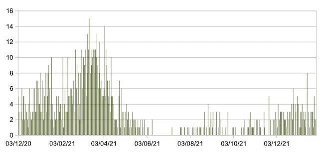 Il grafico seguente mostra i dati giornalieri relativi ai nuovi ingressi in terapia intensiva nelle Marche 3 dicembre 2020 – 27 gennaio 2022.
