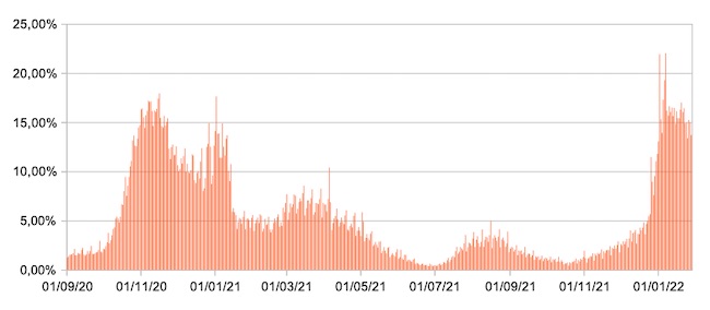 Il grafico mostra la percentuale di tamponi positivi giornalieri su tamponi giornalieri testati ( diagnostici+quelli di controllo) nel periodo 1 settembre 2020 – 28 gennaio 2022 in Italia.