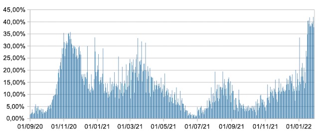 In questo periodo si registrano i valori più alti riscontrabili dal primo settembre 2020 del tasso di positività giornaliero, che oggi è più del doppio di quello del 28/01/2021(era 15,1%).