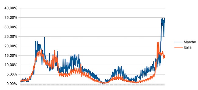 Il grafico seguente illustra l’andamento della percentuale giornaliera di nuovi casi positivi rispetto al corrispondente numero di tamponi (diagnostici +quelli di controllo) effettuati a livello nazionale e nella regione Marche nel periodo 1 settembre 2020 – 28 gennaio 2022.