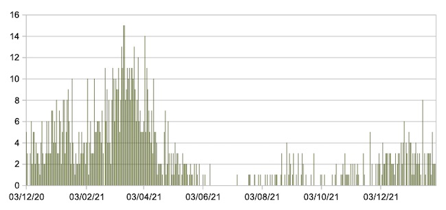 Il grafico seguente mostra i dati giornalieri relativi ai nuovi ingressi in terapia intensiva nelle Marche 3 dicembre 2020 – 28 gennaio 2022.